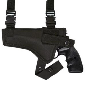 This black nylon fully lined harness and double ammo pouch is an ambidextrous shoulder holster combination. Holster has an adjustable thumb break with a steel shank for quick access. There are ties downs on both sides of the holster and ammo pouch. Made in the USA.