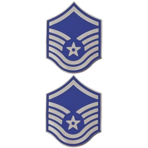 United States Air Force uniform regulations call for the wear of the Air Force Master Sergeant metal rank insignia with a variety of garments. The E-7 Master Sergeant Chevron is regulation, full size, blue and silver plated chevron. Chevrons sold in pairs. This is the same device that is supplied to the U.S. Air Force, Air National Guard, Air Force Reserve units, and sold in the Air Force Base Exchanges. This metal chevron would be a great gift idea and a wonderful addition to your military collection.