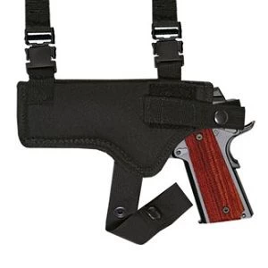 This black nylon fully lined harness and double ammo pouch is an ambidextrous shoulder holster combination. Holster has an adjustable thumb break with a steel shank for quick access. There are ties downs on both sides of the holster and ammo pouch. Made in the USA.