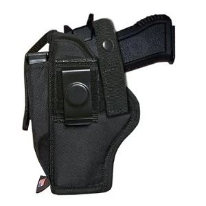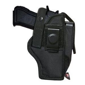 This black nylon fully lined holster is an ambidextrous belt and clip combination. Holster has an adjustable thumb break with a steel shank for quick access. The magazine pouch holds double stacked or two single stacked magazines. There are belt loops on both sides of holster and the 2″ metal clip can be moved to either side. For security, these holsters are designed to wear with the clip on the pants and the belt through the loop to insure a more stable fit.