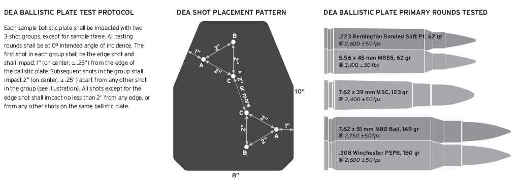 The Hesco Model D220 were specifically designed for the DEA plate testing protocols. Each sample ballistic plate shall be impacted with two 3-shot groups, except for sample three. All testing rounds shall be at 0º intended angle of incidence. The first shot in each group shall be the edge shot and shall impact 1” (on center; ± .25”) from the edge of the ballistic plate. Subsequent shots in the group shall impact 2” (on center; ± .25”) apart from any other shot in the group (see illustration). All shots except for the edge shot shall impact no less than 2” from any edge, or from any other shots on the same ballistic plate. The threats tested are also some of the most common rifle rounds on the market today. These plates can also be special ordered with a polyurea coating.