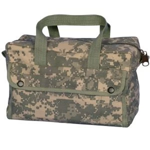Made tough. Heavy-duty army cotton canvas with a hard fiber bottom to boot. The bag has two outer snap flap close pockets, one on each side. Perfect for a tape measure or pad of paper. The inside has four divider pockets on each side. Great for screwdrivers or pencils. 14″ heavy-duty main zipper. Cotton web carry handles. Measures 11 x 7 x 6″.