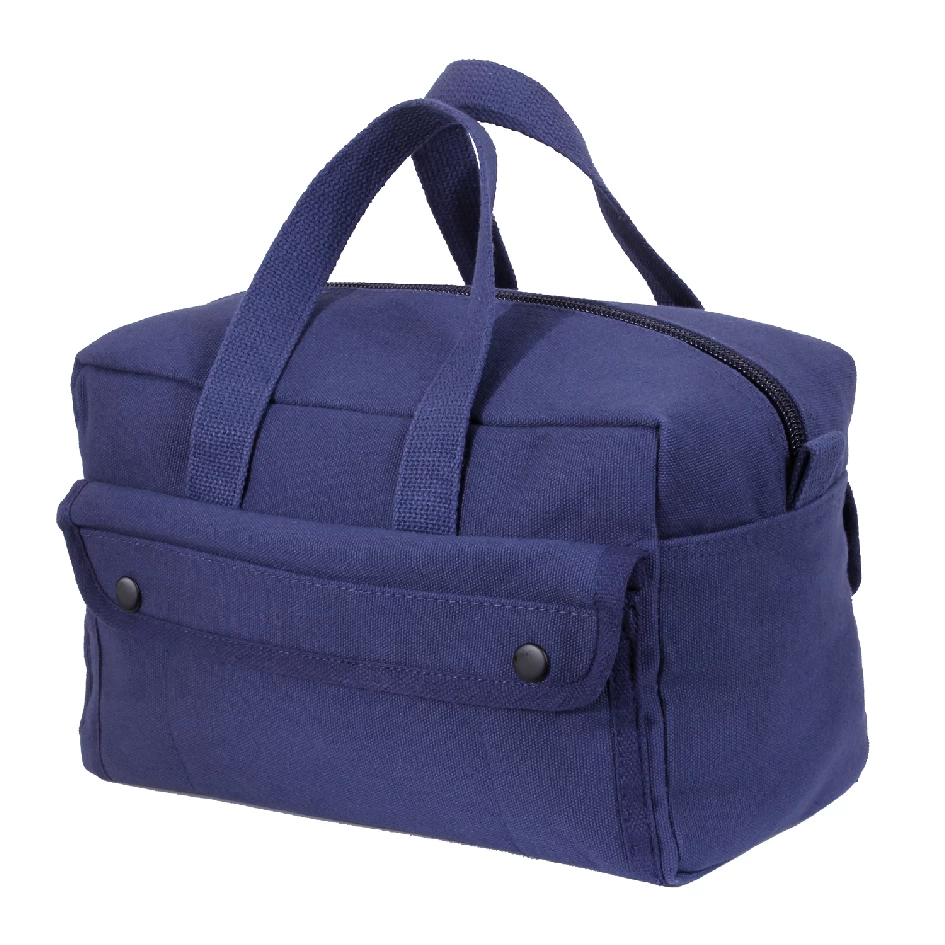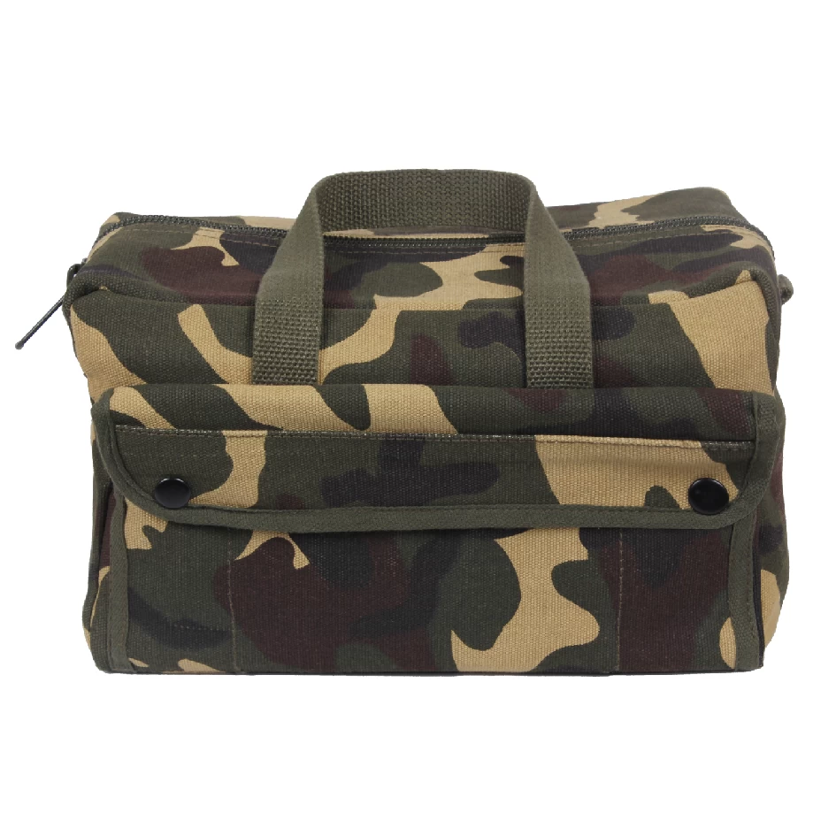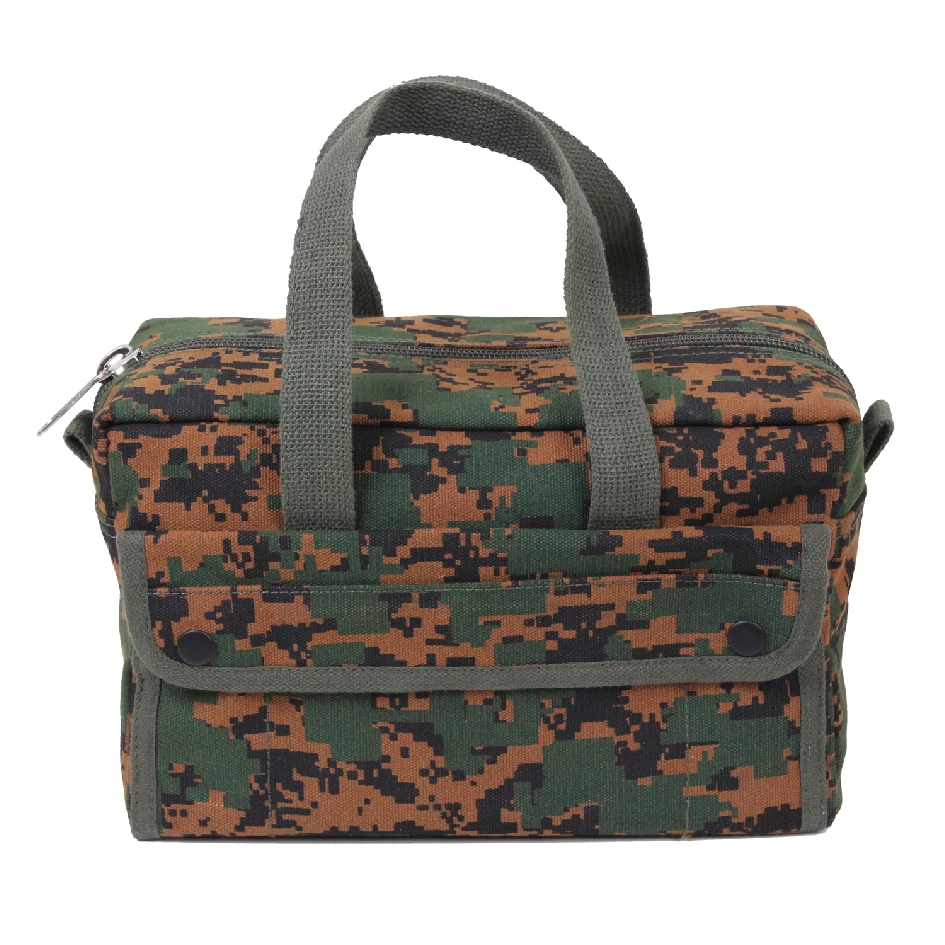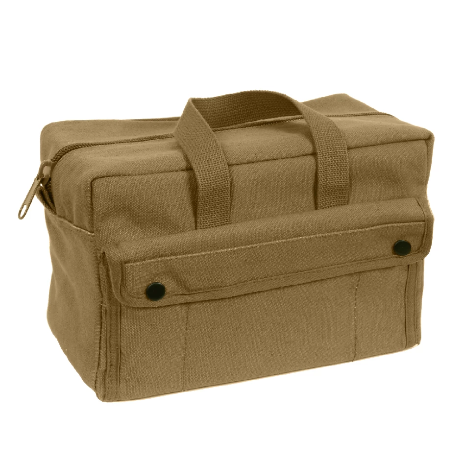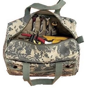 Made tough. Heavy-duty army cotton canvas with a hard fiber bottom to boot. The bag has two outer snap flap close pockets, one on each side. Perfect for a tape measure or pad of paper. The inside has four divider pockets on each side. Great for screwdrivers or pencils. 14″ heavy-duty main zipper. Cotton web carry handles.