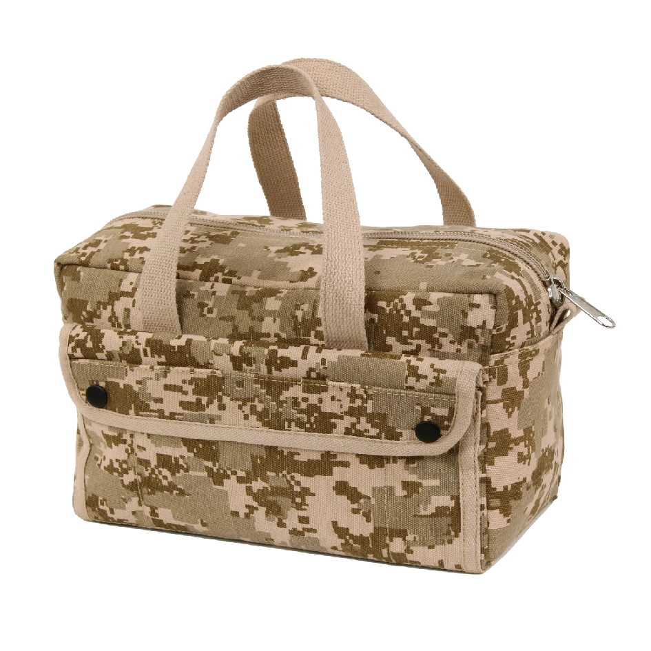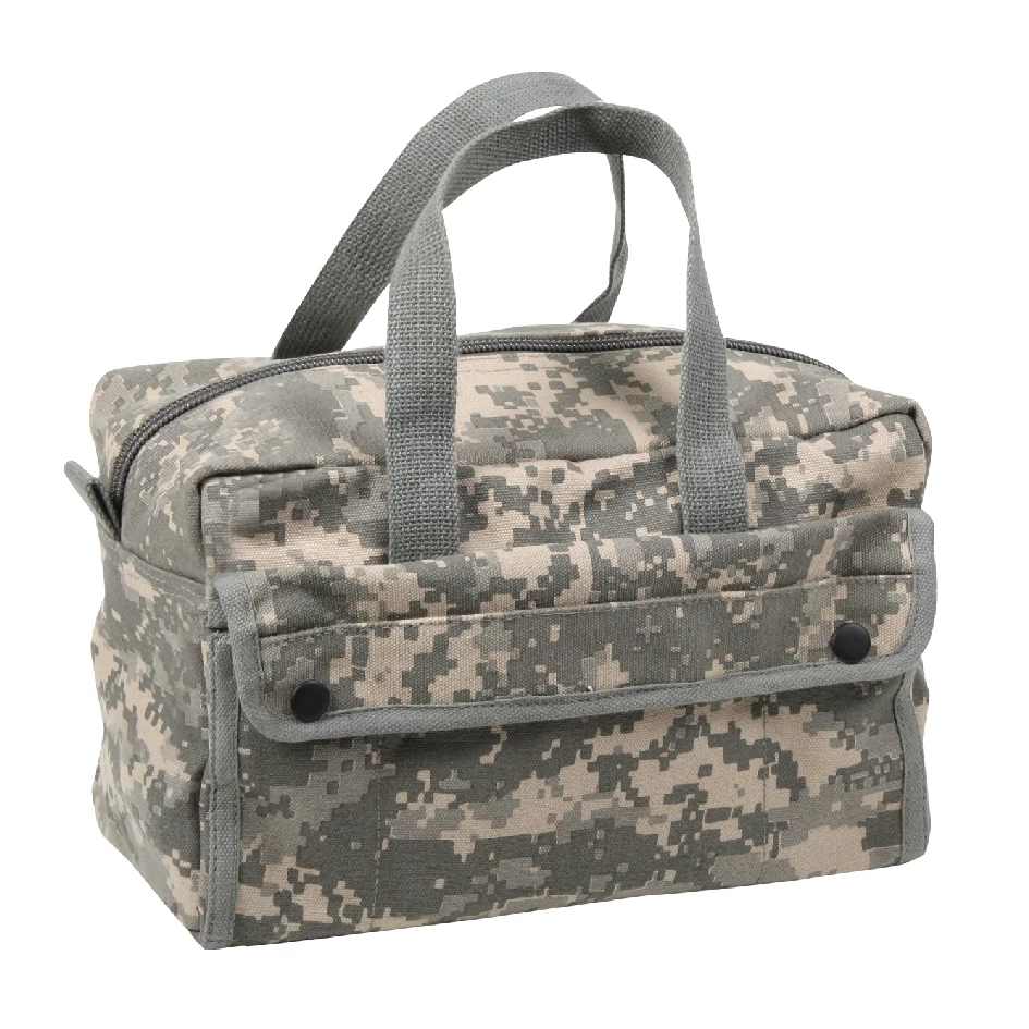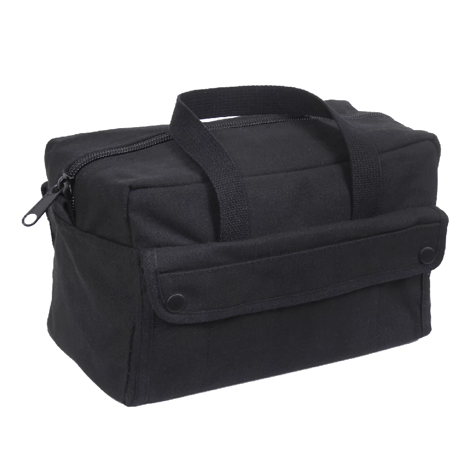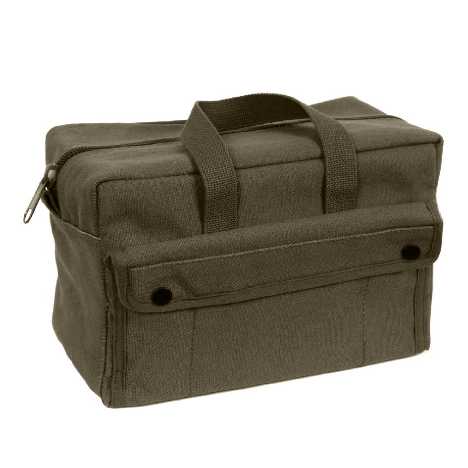 Made tough. Heavy-duty army cotton canvas with a hard fiber bottom to boot. The bag has two outer snap flap close pockets, one on each side. Perfect for a tape measure or pad of paper. The inside has four divider pockets on each side. Great for screwdrivers or pencils. 14″ heavy-duty main zipper. Cotton web carry handles.