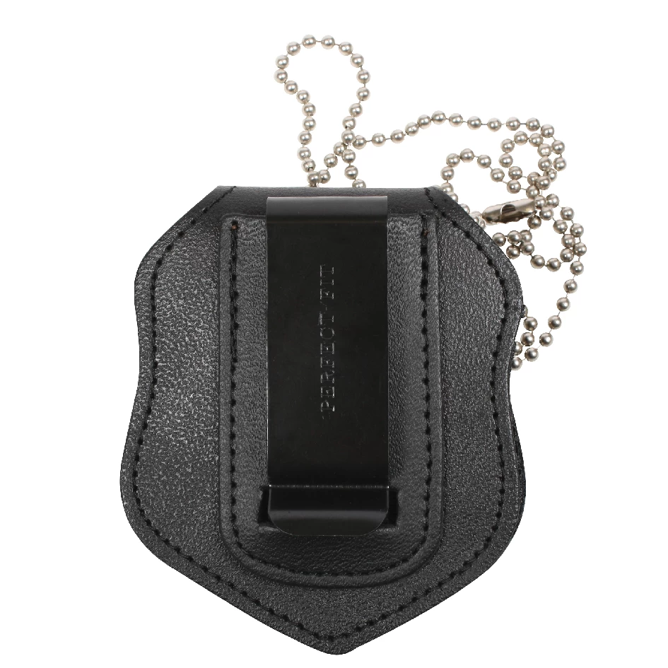 Leather Police Badge Holder features a cutout and pinholes that are designed to fit an NYPD Style police badge. The badge holder features dual carry options with a 32-inch chain that can be worn around your neck, as well as a sturdy iron clip that can be placed on your uniform.