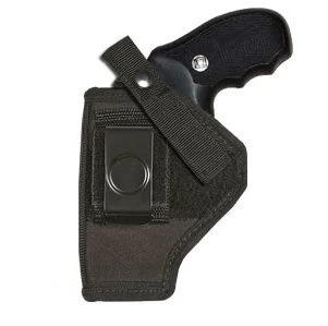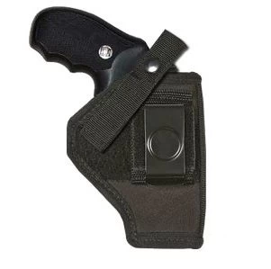 This black nylon fully lined holster is an ambidextrous belt and clip combination. Holster has an adjustable thumb break with a steel shank for quick access. There are belt loops on both sides of holster and the 2″ metal clip can be moved to either side. For security, these holsters are designed to wear with the clip on the pants and the belt through the loop to insure a more stable fit.