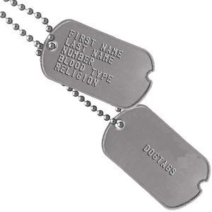 Our dog tags are embossed on location at our warehouse. Dog Tag Kit comes with 2 tags, a long chain and a short chain. Our tags are made to comply with military standards, making them great for military personnel. They are also great for parties, allergy identification, joggers, and so much more! You will not find a better price for dog tags!