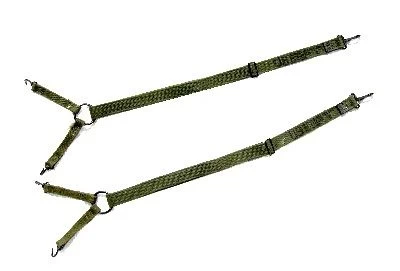 Nice original set of Vietnam War period M1941 USMC combat suspenders in unissued condition. Both suspenders are well marked. Metal hardware is in good condition. The Marine Corps WWII era straight back design cotton suspenders were only one-inch wide and had no shoulder padding. The four front belt supports had hook ends, whilst the rear straps terminated with snap hooks.